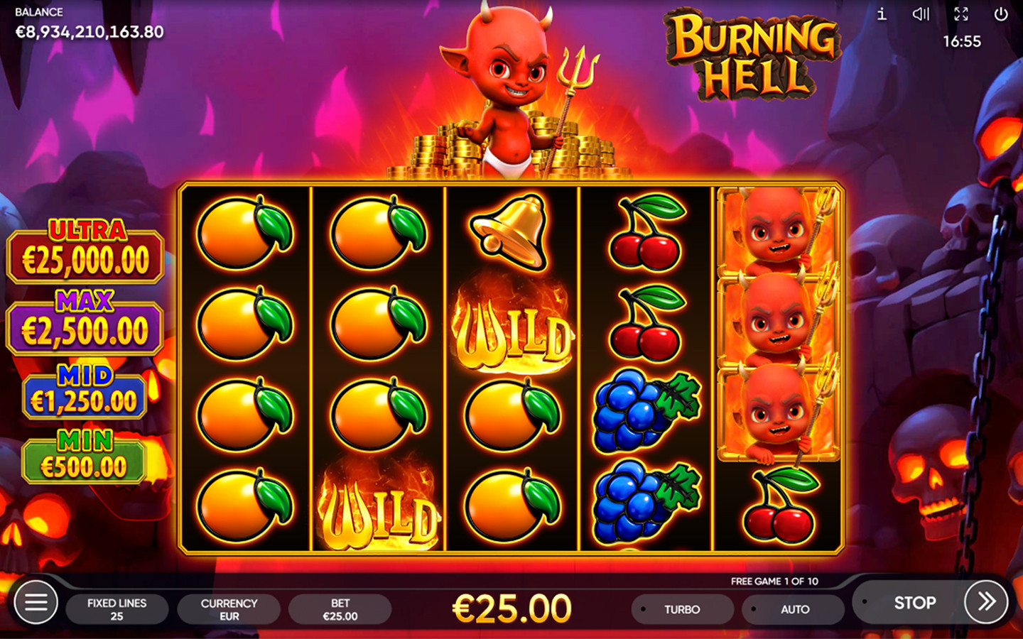 Enter the fiery world of Burning Hell, where a mischievous little demon loves to play devilish games with unsuspecting souls. But beware —the devil has a sinister secret waiting for you, and he won’t let you escape his domain so easily! 3 or more Scatter symbols trigger Free Games with vertically Expanding Wild on every spin! With each spin, you dive deeper into the inferno, battling flames and demonic tricks to reveal incredible rewards. Expanding Wild appears on the reels 2, 3, and 4 in both the main game and Free Games.